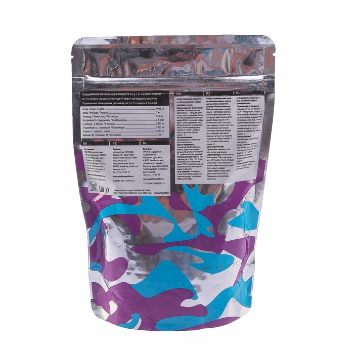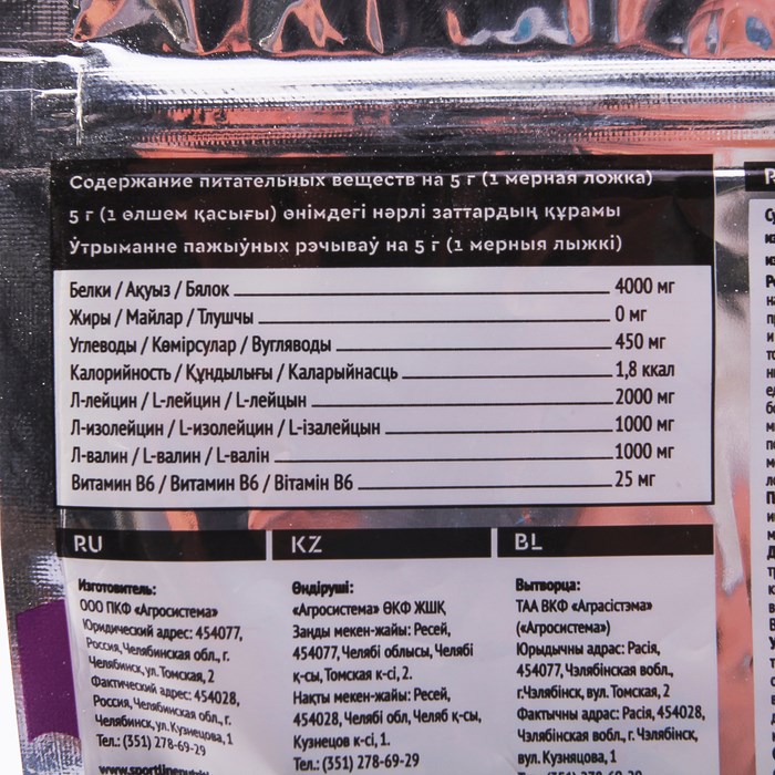 Пищевая ценность (на порцию 5 г): белки 4000 мг, жиры 0 мг, углеводы 450 мг, л-лейцин 2000 мг, л-изолейцин 1000 мг, л-валин 1000 мг, витамин В6 25 мг.