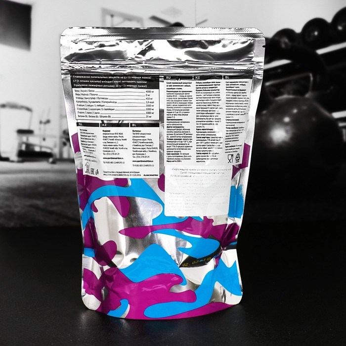 Пищевая ценность (на порцию 5 г): белки 4000 мг, жиры 0 мг, углеводы 450 мг, л-лейцин 2000 мг, л-изолейцин 1000 мг, л-валин 1000 мг, витамин В6 25 мг.