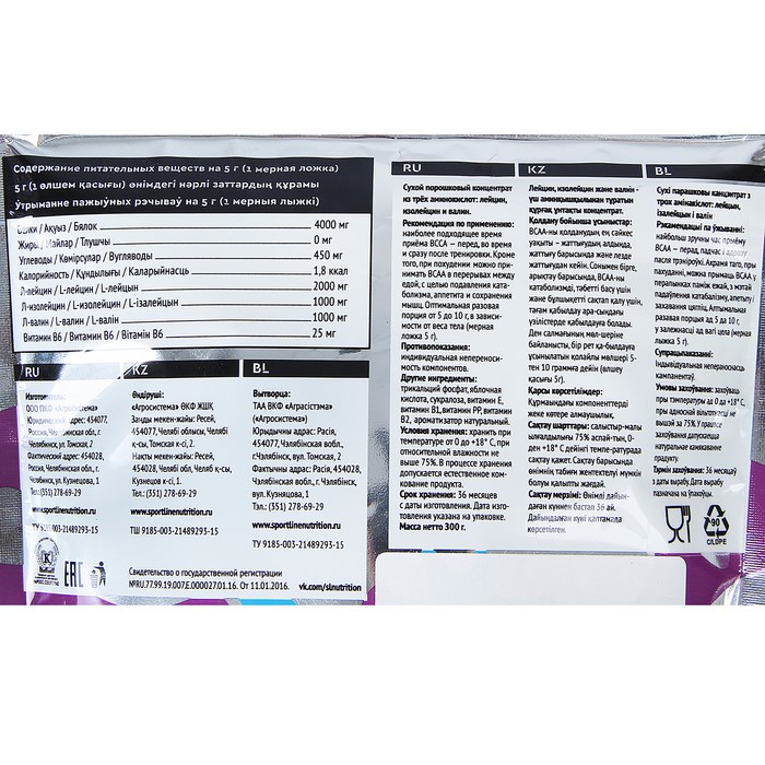 Пищевая ценность (на порцию 5 г): белки 4000 мг, жиры 0 мг, углеводы 450 мг, л-лейцин 2000 мг, л-изолейцин 1000 мг, л-валин 1000 мг, витамин В6 25 мг.