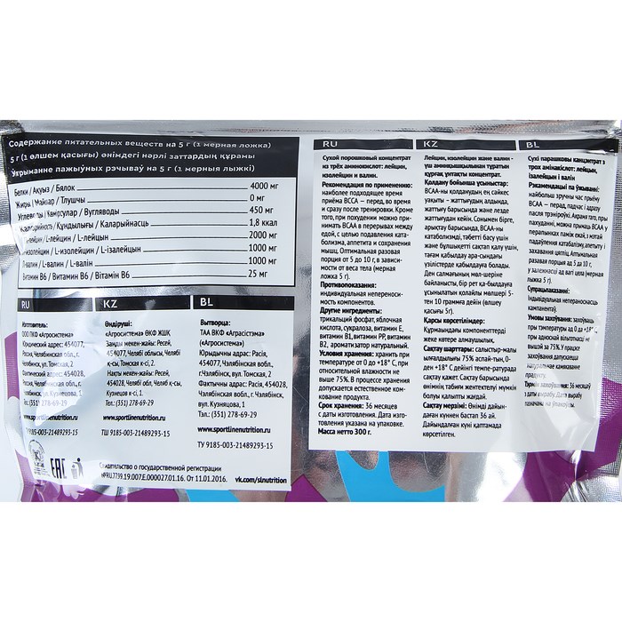 Пищевая ценность (на порцию 5 г): белки 4000 мг, жиры 0 мг, углеводы 450 мг, л-лейцин 2000 мг, л-изолейцин 1000 мг, л-валин 1000 мг, витамин В6 25 мг.