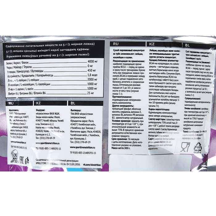 Состав: л-лейцин, л-изолейцин, л-валин, витамин В6, трикальций фосфат, яблочная кислота, сукралоза, витамин Е, витамин В1, витамин РР, витамин В2, ароматизатор натуральный.