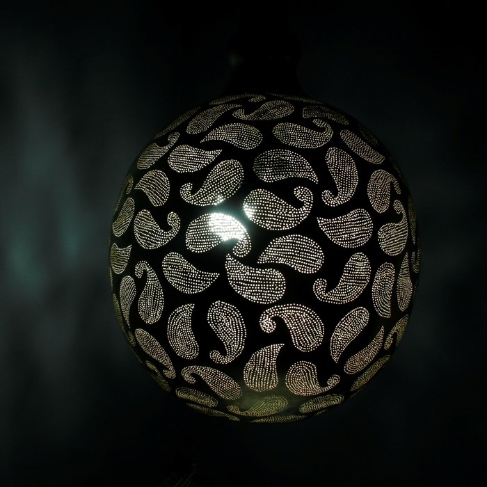 Люстра-шар Paisley получила свое название неслучайно, ведь «Пейсли» - это хорошо знакомый всем узор из так называемых «восточных огурцов», появившийся, по-видимому, в Персии много веков тому назад. Именно эти «огурчики», складывающиеся из крошечных отверстий, мы и можем увидеть на абажуре. Круглые отверстия миниатюрны, но именно благодаря им люстра при включении кажется буквально насквозь пронизанной тонкими лучиками света, а на стены и потолок ложатся причудливые отсветы и теневые узоры. Украсьте интерьер своего дома этим необычным предметом, совместившим в себе традиционные восточные мотивы и выразительный стиль современности.