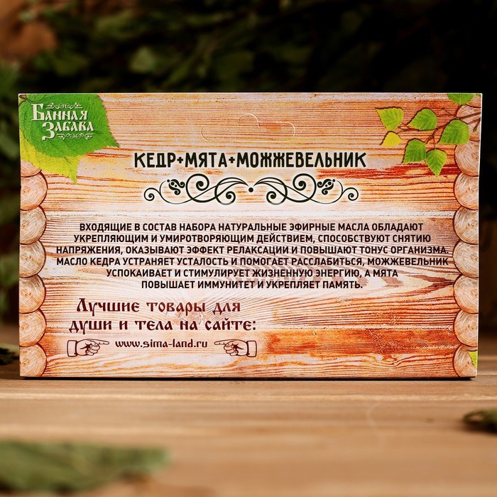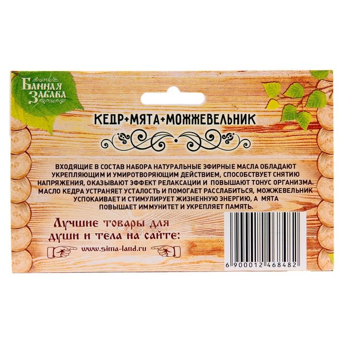 Вам по душе походы в горячую, жаркую, наполненную душистым паром русскую баньку? Место, где каждый может расслабиться и ощутить полное умиротворение… Чтобы получить от банных процедур ещё больше пользы и удовольствия, захватите с собой набор "Кедр, мята, можжевельник" - 3 эфирных аромамасла по 15 мл. Это природный источник крепкого здоровья из самого сердца Сибири. Оно поможет отдохнуть душой, снимет напряжение, усталость и стресс, способствует выводу токсинов из организма и обеспечит полную энергетическую релаксацию и обновление.