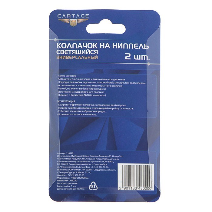 Светящийся колпачок на ниппель Cartage, микс, набор 2 шт