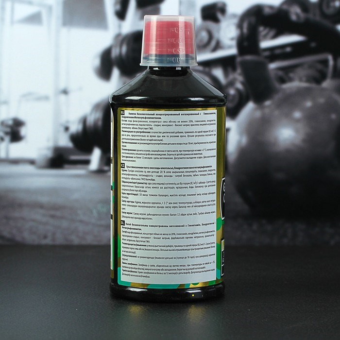 Состав: вода фильтрованная, концентрат сока натуральный не менее 20%, глюкозамин, хондроитин, метилсульфонилметан, подсластитель – сладин, консервант – бензоат натрия, краситель пищевой натуральный, ароматизатор натуральный, отсутствует ГМО.