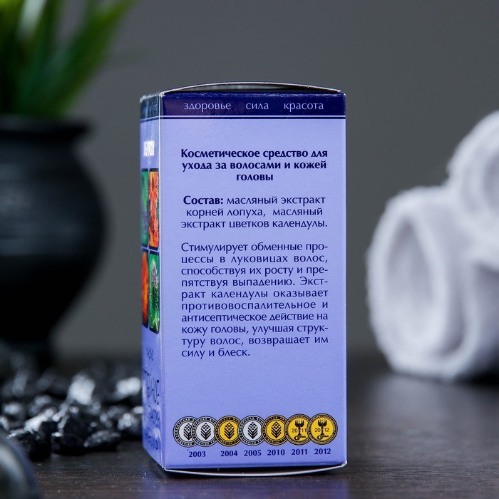 Экстрактивные вещества корня лопуха стимулируют обменные процессы в луковицах волос, способствуя их росту и препятствуя выпадению. Экстракт календулы оказывает противовоспалительное и антисептическое действие на кожу головы, улучшая структуру волос, возвращает им силу и блеск.